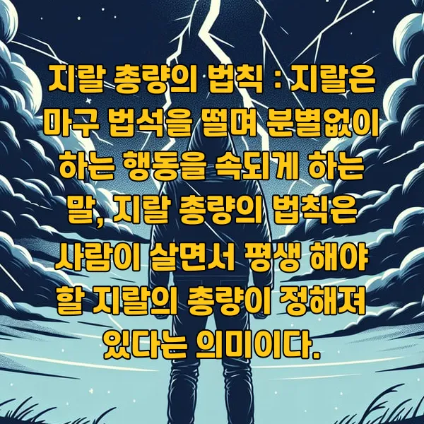 인생을 살아가면서 불가항력적인 힘에 휘둘려 본 경험 이 있으십니까? 마치 정해진 운명처럼 끊임없이 괴로운 상황에 직면하게 된다면, ' 지랄 총량의 법칙 '을 떠올리게 됩니다. '지랄'이라는 다소 과격한 단어 선택에 당황하셨을 수도 있겠습니다. 하지만 이 법칙은 인간이 일생 동안 겪어야 하는 좌절, 실패, 고난 등 을 '지랄'이라는 단어로 함축하여 표현한 것입니다. 본 포스팅에서는 ' 지랄 총량의 법칙 '이란 무엇인지, 그리고 이 법칙에 대한 오해와 진실 을 낱낱이 파헤쳐 보겠습니다. 나의 지랄 총량은 얼마나 남았는지 , 또한 이 총량을 줄이는 방법은 무엇인지 심도 있게 논의하여 삶의 지혜를 얻는 시간을 가져보도록 하겠습니다.
